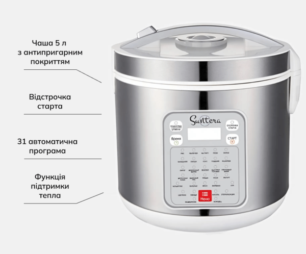 Купити мультиварку Suntera AS-1020 в Україні за вигідною ціною. Мультиварка 5 літрів з 31 програмою. Ідеальна для приготування каш, супів, випічки та інших страв. Мультиварка з функцією відкладеного старту та підтримкою температури. Suntera AS-1020 відгуки. Доставка по Києву, Харкову, Львову, Одесі, Дніпру та іншим містам України. Мультиварка для кафе, мультиварка для ресторану, професійна мультиварка.
